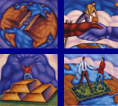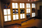 | Der grosse Deal Installation im Rahmen der Ausstellung der PreisträgerInnen des eidg. Wettbewerbs für freie Kunst Museum zu Allerheiligen Schaffhausen 1998 In die Fensterfront des Treppenaufgangs wurden zusätzlich zur bereits bestehenden Scheibe von Otto Dix Der heilige Martin von 1952 - welche übrigens von einer Gemeinde aus der Region nach der Bombardierung des Museums im zweiten Weltkrieg gespendet wurde - vier weitere Bildfenster im gleichen Format eingefügt. Die Bilder stammen aus der Clip Art Datenbank von Adobe und zeigen illustrierte Motive aus der Businesswelt. Die Fenster bilden durch ihre Anordnung eine Art Indexkurve, in welcher das Bild vom heiligen Martin als Freund und Helfer in der Not integriert ist. Clip Art wird gerne zur Illustration von Geschäftsberichten und Businessmagazinen verwendet und kann weltweit über Internet oder Stockimage-Kataloge bezogen werden. Beim Versuch einfach verständliche Bildmethapher für die Vorgänge, Wünsche und Ängste im Business zu finden, greifen die Illustratoren immer wieder auf Motive aus der absurden Malerei zurück oder pflegen eine Art naiver Realismus. Viele der beliebtesten Bilder erinnern denn auch an den faschistischen (oder sozialistischen) Realismus und stellen sozusagen eine Form von kapitalistischem Realismus dar. Die für die Installation ausgewählten Motive sollen globale Kontakte, interkontinentale Geschäftsabschlüsse und Deals sowie der ganz grosse Gewinn symbolisieren. In Verbindung mit der sakralen Tradition von Bildfenstern und in der Kombination mit der religiös-moralischen Darstellung des guten Helfers Martin erhält die neu entstandene Bilder-Geschichte allerdings eine erschreckend ideologische Dimension. |