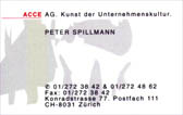 | ACCE Agency for Communication, Culture and Event in Zusammenarbeit mit Raoul Marek und Simon Beer Zürich 1991 Mit der Gründung von ACCE (Agency for Communication, Culture and Event) in Form einer Aktiengesellschaft wird eine wirtschaftskompatible Basis geschaffen, um künstlerische Ansätze und Ansprüche über den Kunstkontext hinaus im interessierte Kreise einzubringen. Die Aktiengesellschaft wurde, nachdem sich ein wirtschaftlicher Erfolg nicht abzeichnete, an einen Finanzmarkler verkauft und geriet später auf Grund seiner dubiosen Geschäfte mehrmals in die Schlagzeilen der Medien. |