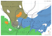 | MigMap Governing Migration Kartografie zur europäischen Migrationspolitik MigMap wurde 2004/2005 von Labor k3000 (Peter Spillmann/Susanne Perin/Marion von Osten/Michael Vögeli) und den ForscherInnen von TRANSIT MIGRATION (Sabine Hess, Serhat Karakayalı, Efthimia Panagiotidis und Vassilis Tsianos) entwickelt und realisiert. MigMap will im Gegensatz zu gängigen Kartierungsverfahren in der Migrationsforschung ein Bild davon vermitteln, wie und wo die „Wissensproduktion“ über und durch Migration zur Zeit stattfindet, wer daran partizipiert und wie die neuen Formen des suprastaatlichen Regierens im europäischen Migrationsregime funktionieren: wie z.B. die Implementierung europäischer Standards in Politik und Zivilgesellschaft abläuft, welche Stellen, Personen und Institutionen daran beteiligt sind, wie die verschiedenen öffentlichen oder privaten Akteure zusammenhängen und finanziert sind, welche inhaltlichen, räumlichen und personellen Überschneidungen oder Abgrenzungen bestehen, wie Zuständigkeiten verteilt und legitimiert werden und auf welchen Theorien, Begriffen oder Diskursen die momentan gültigen Paradigmen basieren. Die Karten haben also weniger den Zweck, Gegeninformation über die Migration zugänglich zu machen als vielmehr Akteure und Strukturen auf der Seite des Regimes darzustellen, auf ihre Funktion hinzuweisen und sie damit kritisier- und verhandelbar zu machen. In den letzten Jahren hat sich in Europa ein neues Grenz- und Migrationsregime herausgebildet, anhand dessen sich neue, z.T. suprastaatliche Formen des Regierens erkennen und darstellen lassen. Dazu gehören z.B. nur noch teilweise oder überhaupt nicht mehr staatlich kontrollierte Organisationen, die im Auftrag der Staatengemeinschaft das Management einzelner gesellschaftlicher Bereiche übernehmen, wie die IOM (International Organization for Migration), oder neue Formen der Wissensproduktion und des Wissensmanagements mittels Datenvernetzung, wie sie z.B. im SIS (Schengen Information System) praktiziert werden. Neben offensichtlichen Akteuren wie IOM, UNHCR oder EU, spielen viele kleinere, halböffentliche oder private NGOs, zahlreiche migrantische Initiativen aber auch einzelne Personen und Forschungsinstitute eine Rolle. Die komplexe Wirklichkeit des aktuellen Grenzregimes lässt sich nicht mehr länger einfach „abbilden“, vielmehr nur assoziativ, entlang scheinbar unverbundener Teilaspekte imaginieren. Die Migrationsrealitäten zu Beginn des 21. Jahrhundert sollen nicht verobjektiviert werden, wie es bestehende Karten meist tun, sondern das Projekt MigMap will ein dynamisches Kräftefeld zur Darstellung bringen, indem die Wechselwirkungen zwischen AkteurInnen und Diskurs, zwischen staatlichen Politiken und Migration, zwischen Subversion und Kontrolle vorstellbar gemacht werden. Über die vier bisher erarbeiteten Karten „Akteure“, „Diskurse“, „Europäisierung“ und „Orte und Praktiken“ sind zahlreiche Informationen zu einzelnen Akteuren, Debatten, Prozessen und Ereignissen abrufbar, die in ihrem Zusammenspiel das ergeben, was momentan die Europäische Migrationspolitik ist. Die Möglichkeit der Verknüpfung von Übersicht mit Infor mationen zu einzelnen Details ist auch einer der zentralen Gründe, wieso das Projekt für das Inter net konzipier t wurde. Ein anderer ist die Option, die Kar ten bei Bedarf laufend anpassen, nachtragen und mit weiteren z.B. interaktiven Funktionen versehen zu können. Je nach Bedürfnis punktuell abr ufbare und kontinuierlich veränderbare Repräsentation, die MigMap darstellt, wird dem Anspr uch einer nicht verobjektivierenden Darstellung sicher besser gerecht als z.B. eine gedruckte Karte oder Publikation. MigMap repräsentiert Akteure, Strukturen und Praktiken des Migrationsregimes auf der Basis der These von der „Autonomie der Migration“. Aus dieser Perspektive ist es möglich, die aktuellen Verhältnisse nicht als feste Strukturen, sondern als einen Prozess der Aushandlung, des kontinuierlichen Austestens und auch auf der Ebene der Politik der Improvisation zu begreifen. Auf Karte 1, der Karte der Akteure des Migrationsregimes, sind die unterschiedlichen Akteure der Grenze und der Autonomie der Migration eingetragen. Schriftgröße und Farbe geben Bedeutung und Art der jeweiligen Institutionen oder Organisationen an. Es wird dabei vor allem sichtbar, wie viele unterschiedliche Akteure neben den staatlichen Organen beteiligt sind. Angaben zur Funktion und zum Eigenverständnis der einzelnen Akteure sowie Links zu ihren Selbstdarstellungen und Mission Statements auf dem Internet vermitteln einen Einblick in die oft unscharf abgegrenzten Aufgabenbereiche, vielschichtigen Überlagerungen der Zuständigkeiten und teilweise Interessenskonflikte, welche die Summe der Akteure zu einem undurchschaubaren Filz von Aktionismus werden lässt. Karte 2, die Karte der Diskurse zeigt das Migrationsregime als Wissensregime. Hier laufen Themenfelder ineinander, verdrängen oder schließen einander gegenseitig ein. Dabei handelt es sich um die wichtigsten Diskurse, anhand deren Migrationspolitik gemacht wird bzw. mit denen zum Zweck der Durchsetzung bestimmter Politiken argumentiert wird: Menschenrechte, Sicherheit, Asylrecht, Traff icking, war on terrorism und weite- re. Einzelne Punkte an den Berührungsstellen der Felder lassen erkennen, welche migrantischen „Subjekte“ hier jeweils konstruiert werden: GastarbeiterInnen, illegale Migranten, Schlepper, Opfer, Wirtschaftsflüchtlinge, politisch Verfolgte. Die Kämpfe der Migration und ihre Kampagnen produzieren im Feld der Diskurse weiße Flecken der Gegenöffentlichkeit, während die Begrifflichkeiten rund um das ökonomistische Konzept des Migrationsmanagement auf der Karte neoliberale Plattformen bilden. Die Karte zeigt, dass die Diskurse niemandem „gehören“, sondern die Praktiken und Argumentationen verschiedenster Akteure durchkreuzen, sich damit gegenseitig verstärken können, aber auch dazu 
